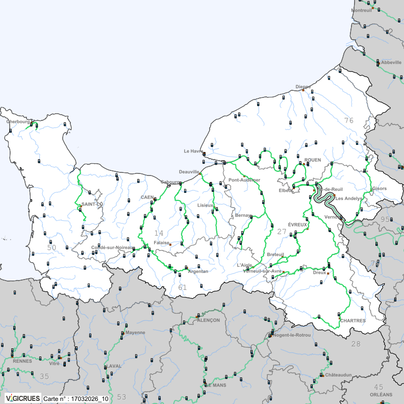 Sur le territoire du PAPI, les cartes ci-jointes présentent les communes bénéficiant de ce service Vigicrues Flash, en Seine-Maritime et dans l’Eure (il s’agit des communes non grisées, sur lesquelles on voit apparaître les cours d’eau couverts) :