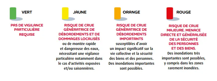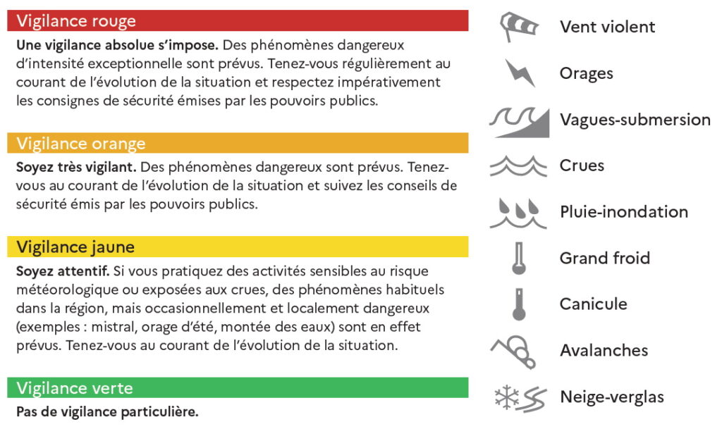 Météo France a mis en place en octobre 2001 un service de vigilance pour informer les citoyens et les pouvoirs publics en cas de phénomènes météorologiques dangereux. Ce dispositif couvre la journée en cours et le lendemain. Cette information complète les prévisions météorologiques. Elle donne une information clef à l’échelle départementale selon un code couleur et selon les phénomènes. En matière de risques inondation, les phénomènes orageux, pluie-inondation, crue, tempête, vague-submersion sont à regarder.