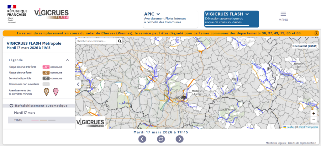 Le service Vigicrues Flash complète le réseau Vigicrues et propose de suivre les cours d’eau ne bénéficiant pas de la vigilance vigicrues. Plus de 30 000 km de cours d’eau en France sont couverts par ce service. Il s’agit d’une détection automatique du risque de crue soudaine du cours d’eau et du risque d’inondation pour la commune associée, grâce à un code couleur indiquant le niveau d’avertissement : pas de risque de crue (gris), risque de crue forte (marron) ou risque de crue très forte (rose). Les mairies et intercommunalités (en tant qu’acteurs locaux à la gestion de crise) peuvent s’abonner au service Vigicrues Flash et recevoir gratuitement des avertissements en cas de risque de crue sur les cours d’eau couverts par le service.